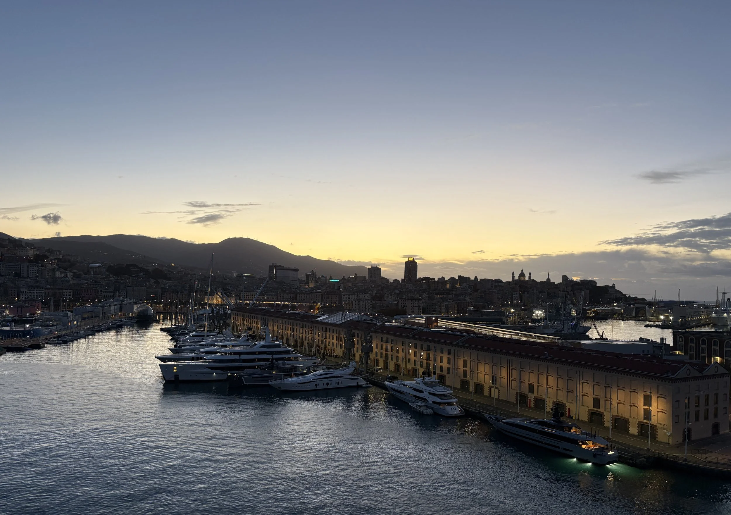 Anreise am Vortag aus der Schweiz mit dem direkten Giruno der SBB nach Genua Piazza Principe mit einer Vorübernachtung im Hotel Continental.