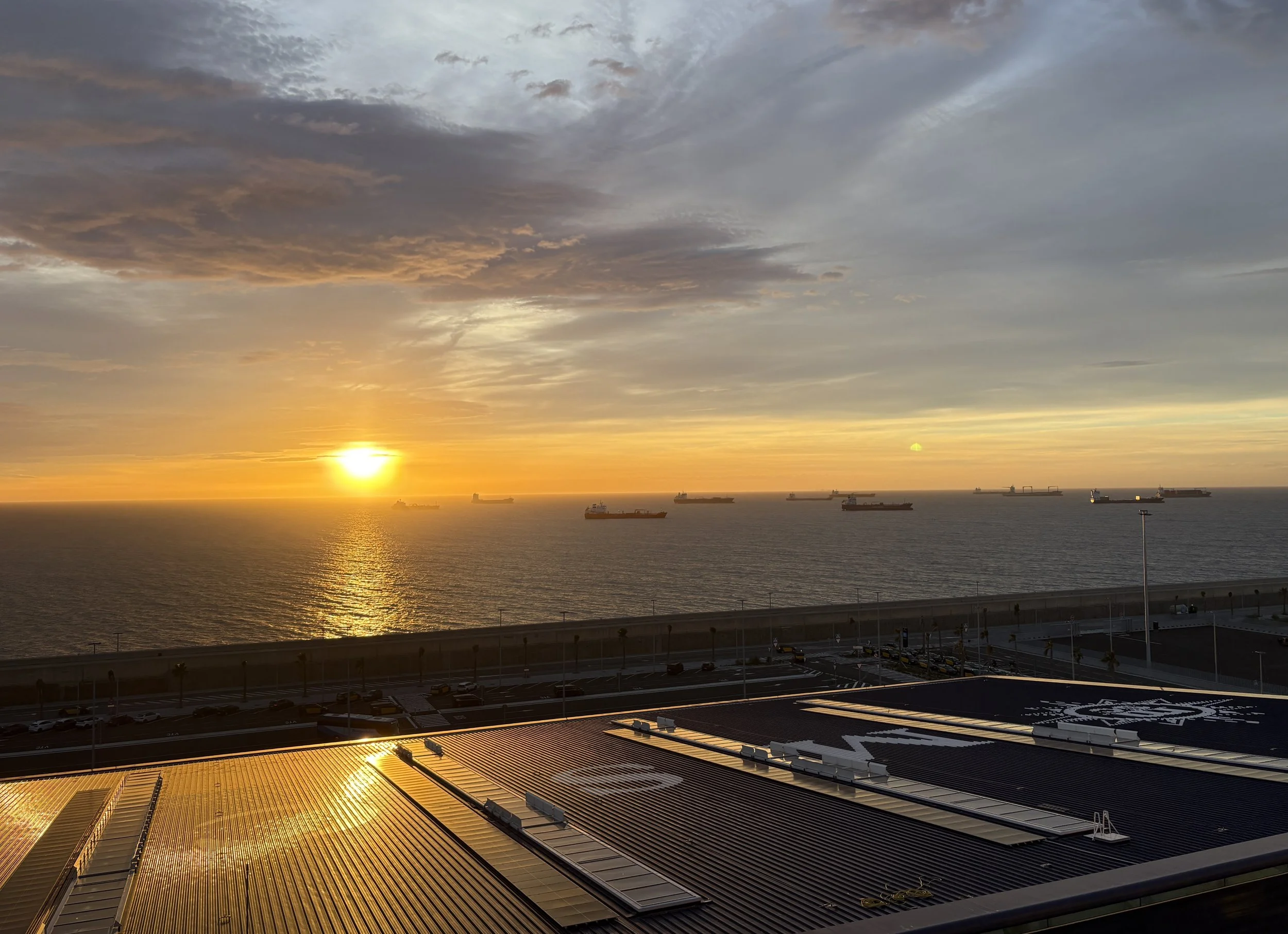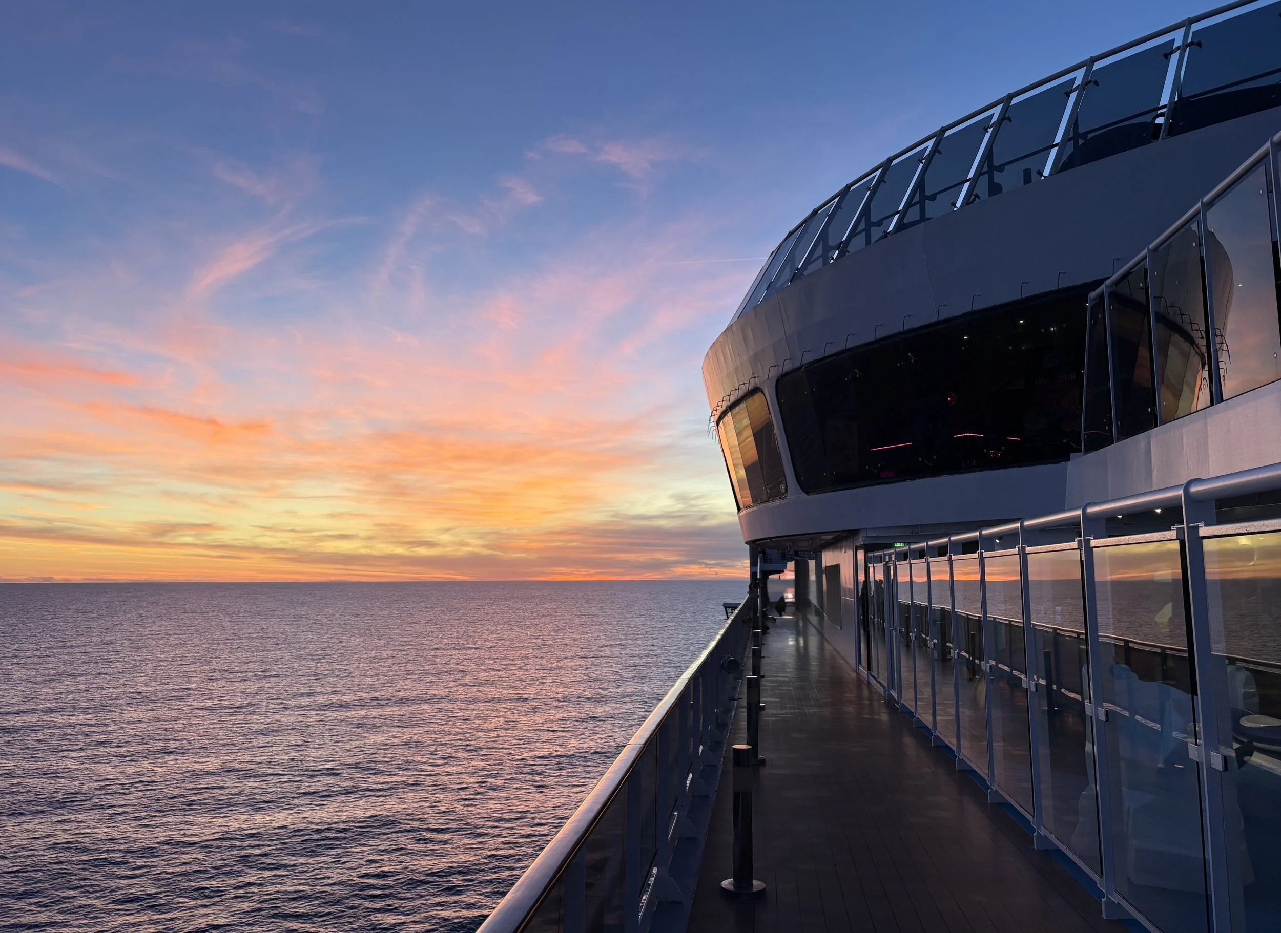 Tag 2 auf der MSC Splendida als Seetag mit rund 11 Knoten (max. 22.87 Knoten) in Richtung Barcelona mit einem Sonnenaufgang wie im Bilderbuch - Zeit das Schiff zu geniessen mit diversen Einladungen wie Behind the Scenes Tour, Special Event Voyagers Club und Cocktail Party im Yacht Club.